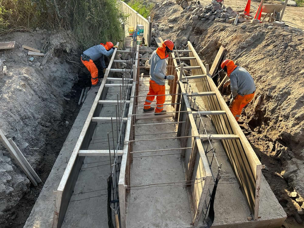 Además, se construye infraestructura complementaria clave para la conectividad y el control del agua. Como parte de estas acciones, ya se cuenta con un puente peatonal en el tramo 1+760, una caída de agua en el 1+560 y un puente vehicular en el 1+350.